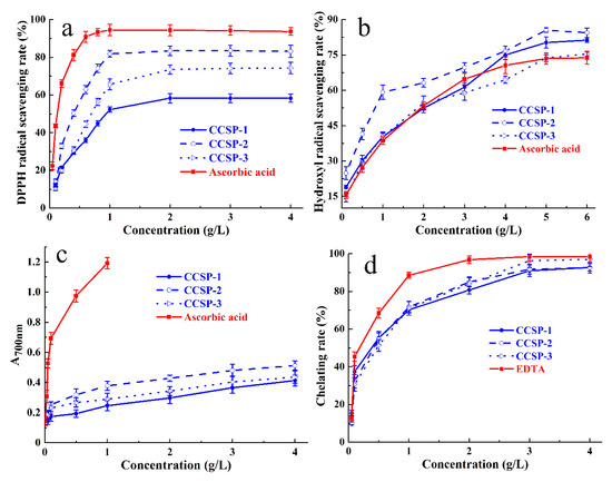 Antioxidant activities of CCSP-1, CCSP-2, and CCSP-3. (a) DPPH radical scavenging activity. (b) Hydroxyl radical scavenging ability determined by o-phenanthroline spectrophotometry. (c) Reducing power determined by potassium ferricyanide method. (d) Chelating ability against ferrous ions. Results are represented as means ± SD (n = 3).