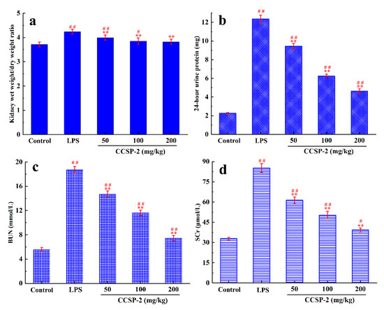 BUN and SCr are the end products of protein- and nitrogen-containing organic metabolism, respectively, and are commonly used clinical indicators of renal function. Figure 4c,d exhibit the effect of CCSP-2 on BUN and SCr levels in LPS-induced septic AKI mice. There was a remarkable difference in BUN and SCr levels between the LPS group and the control group (p < 0.01), showing that LPS treatment caused kidney damage in mice. The BUN and SCr levels in the CCSP-2-treated groups were notably lower than that of the LPS group (p < 0.01), dose-dependently.