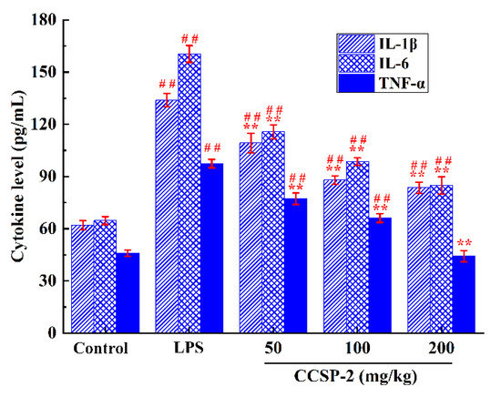 Effect of CCSP-2 on serum TNF-α, IL-1β, and IL-6 levels in LPS-induced septic AKI mice. Results are represented as means ± SD (n = 8). ** p < 0.01, by contrast with the LPS group; ## p < 0.01, by contrast with the control group.