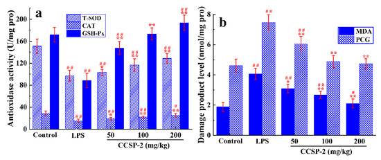 Effect of CCSP-2 on antioxidase activity (a) and oxidative damage product level (b) of kidney tissue in LPS-induced septic AKI mice. Results are expressed as means ± SD (n = 8). * p < 0.05 and ** p < 0.01, compared with the LPS group. # p < 0.05 and ## p < 0.01, compared with the control group.