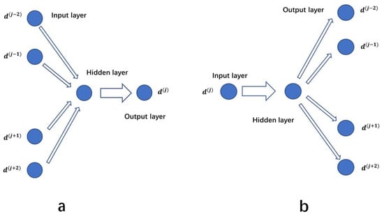 CBOW constructs the mapping relationship between the two adjacent words before and after the current word as the context, that is, the current word is predicted by the context, that is, . The specific structure of the model is shown in Figure 1a. The average value of the word vector of the context is input as the weight, and then converted into the conditional probability of the current word under the condition of the context through the softmax activation function, to realize the semantic association between the current word and the context.