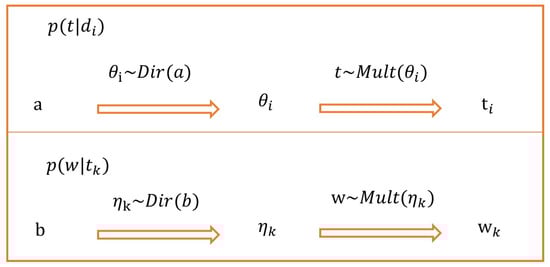 Text data is composed of a large number of sentences. In order to avoid the problem of dimension explosion, we cannot directly construct vectors with sentences as feature dimensions. Sentences can be regarded as a sequence of words [], so we can extract the representative words, that is, keywords, and then generate vectors based on keywords by constructing certain models and algorithms. There are two kinds of text keyword extraction methods, one is the term frequency inverse document frequency (TFIDF) method based on frequency, and the other is the topic model method based on spatial mapping [,]. The TFIDF method measures the importance of a specific word in each sentence by two factors: term frequency, that is, the frequency of a word in the sentence, and inverse document frequency, that is, the reciprocal of the frequency of the sentence containing the above words. Although this method constructs the correlation between words and sentences, it only analyzes them from the perspective of frequency, and fails to construct the mapping relationship based on the understanding of text semantics. In order to extract keywords from text based on understanding semantic structure, the topic model method is proposed. The topic model is an unsupervised learning model for latent semantic mining and analysis of text data. Its core is to construct the mapping between sentence space and topic space and between topic space and word space by setting topic variables as intermediate variables. Using spatial mapping to analyze text semantics is not only conducive to clustering words to reduce redundancy, but also realizes dimension reduction operation, to better reflect the distribution features of words, topics, and sentences. The topic model is mainly composed of latent semantic analysis model (LSA) and latent Dirichlet allocation model (LDA). The core of LSA [] is the operation of singular value decomposition of text matrix to generate the mapping relationship among words, topics, and sentences, that is, word space and sentence space are mapped to relatively lower dimensional topic space, respectively, to explore the latent semantic relationship [,,]. Compared with LSA model, the LDA [,] model focuses on constructing the mapping relationship between the above three variable spaces from the perspective of probability distribution, to avoid the huge amount of matrix operation caused by singular value decomposition operation. By introducing the relevant theories of Dirichlet distribution and multinomial distribution [,], the LDA model can carry out latent semantic mining from the perspective of probability distribution [,,].