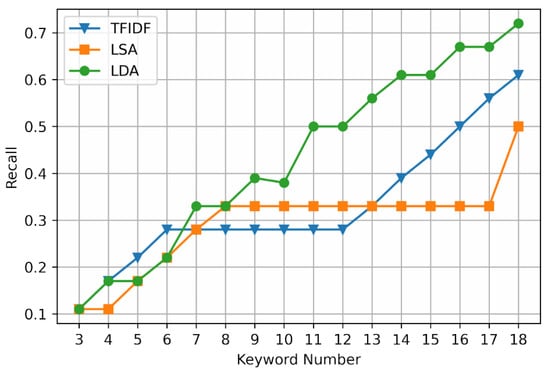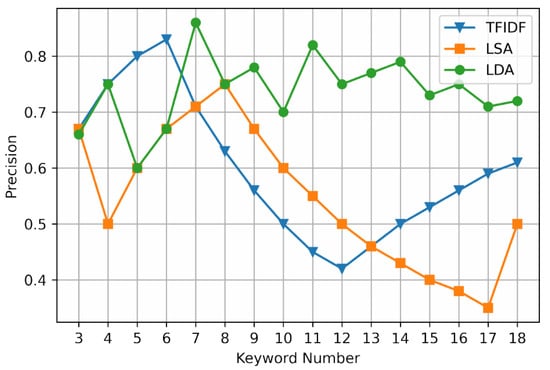 It can be seen from Figure 5, Figure 6 and Figure 7 that in terms of extraction accuracy, when the keyword extraction number is less than or equal to six, the extraction precision of TFIDF method and LSA method shows an increasing trend, while the extraction precision of LDA method fluctuates but is relatively stable. When the keyword extraction number is located in [6,12] and [8,17], respectively, the extraction precision of TFIDF method and LSA method begins to decline, and the extraction precision of LDA method tends to be stable between 0.7–0.8. It can be seen that the method using non-LDA model is not suitable for the extraction of more keywords.