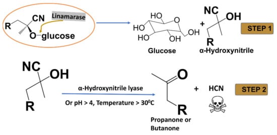 Linamarin and its methylated analogue lotaustralin, are cyanogenic glycosides found in the roots and leaves of cassava (Manihot esculenta), flax (Linum usitatissimum), lima beans (Phaseolus lunatus) and white clover (Trifolium repens) [1]. Cassava is estimated to contain a high amount—about 225 to 1830 mg/kg—of linamarin [1]. The plant’s disruption and damage cause its cells to rupture and allow the hydrolysis of cyanogenic by the enzyme (β-glucosidase) to release unstable cyanohydrin., onsequently, either at favourable conditions or in the presence of hydroxynitrile lyases, degrades to release ketone and toxic HCN (see Figure 1) [2,3,4].