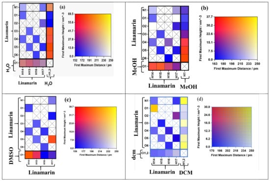 The linamarin molecule contains different atoms that form intramolecular hydrogen bonds as acceptors and donors. To have a precise analysis, we used connection matrix analysis [33] to determine the strength of the interactions of hydrogen and polar atoms within the linamarin compound in different solvents (see Figure 2). The matrix had: the left-hand and right-hand sides and the heat map depicting interaction strength [33]. The rows of the left-hand side matrix correspond to different hydrogen acceptors, while the columns are for all hydrogen donors. The analysis was computed using TRAVIS, which internally calculated the difference radial distribution function (RDF) and provided the height and distance of the first maximum. We exclude 1–2, 1–3 and 1–4 intermolecular interactions and a distance cutoff of 350 pm. The matrix was filled with a black cross if the computed RDF proved no interaction detected. However, if the interaction existed, the matrix was filled with a colour corresponding to the strength of the interaction. The colour scheme on the right panel has two dimensions, which correspond to the first difference RDF maximum’s observed height and distance. For example, the red colour shows firm hydrogen bonding because it is formed at a minimal distance and much larger maximum height. On the other hand, the blue indicates a bond formed at a very short distance but small maximum height, which proves the bond is weak. The yellow corresponds to the hydrogen bond formed at a considerable distance and significant maximum height; thus, the interaction moderated strong.