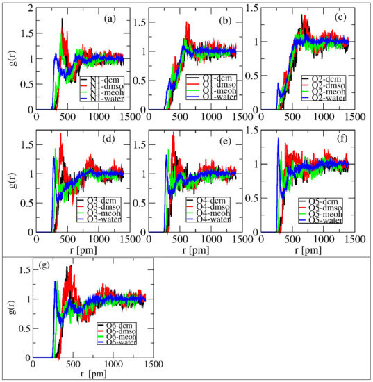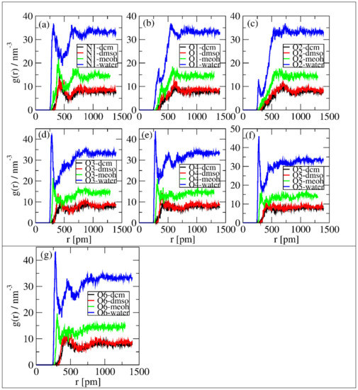 Figure 6 shows the same observations as in Figure 5, but, here, it is evident that in Figure 6a,d–g, intensive peaks formed around 250 to 350 pm. Moreover, in all figures, the intensity of solvents’ interactions with the selected sites follows water > MeOH > DMSO = DCM. This shows that water molecules are more available to interact with linamarin. The discussion in Section 3.1 and Section 3.2 supports these observations.