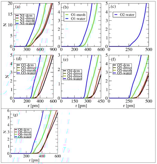 Number of solvent molecules in the first solvation shell for selected sites of linamarin correspond to (a) N1, (b) O1, (c) O2, (d) O3, (e) O4, (f) O5 and (g) O6.