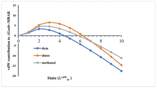 Contribution of the van der Waals force at each stage of the ∆Gsolv calculation using Multistate Bennett acceptance ratio (MBAR).