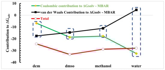 While the LJ term captures attractive dispersion and repulsion (i.e., van der Waals) interactions, the electrostatic term accounts for high-order interactions, such as hydrogen bonding. We found that as the electrostatic interactions were turned on, the relative solvation free energy decreased in all cases. Again, recall that the lower the relative free energy, the more favourable. We found that in state , and the relative free energy was obviously most negative in water. Next, the values in DMSO and methanol were similar, with DMSO being slightly more negative, and DCM was clearly the least negative. This agrees perfectly with our structural analysis, where we expected the relative free energy to be related to the strength of the intermolecular interactions between linamarin and the solvent, specifically, hydrogen bonding, here. In Figure 11, we summarize the total solvation free energy ( to 14), along with its LJ ( to 10) and electrostatic ( to 14) contributions.