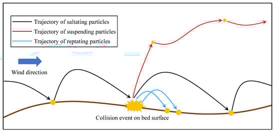 In brief, the numerical model used in this work is a simplified discrete element method (DEM) model. The full-scale DEM model simulates the movement of all the particles in the system through a series of calculations considering particle deformability and using the explicit time integration algorithm to resolve particle collisions. These features lead to excessive computational requirements, which is unacceptable for the long-time mesoscale numerical simulations of this work. To avoid this, our model just tracks moving particles in the air and gains the post-collision velocity components of particles by solving the momentum equations in connection with Coulomb’s law of friction.