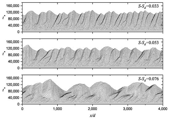 Using the numerical method described above, we first simulated the development of the ripple surface and checked the consequent sand flux variation. It is worth mentioning that in this work we used monodisperse particles to avoid the influence of the particle size distribution. The size of the computational domain was , and the boundary condition was periodic in the x and the y direction. With , the Shields number in all cases ranged from 0.017 to 0.095. Here, we kept S below 0.1, because according to references [19,27,28], for larger Shields number S, the relationship between sand flux Q and S will no longer be linear. The range of S for which the linear scaling law becomes invalid is called the Bagnold-like region. In this region, the average velocity of the particles in the air is not only related to the particle’s dynamic thresholds (threshold Shields number or threshold friction velocity —they correspond to the smallest wind strength that can maintain the particle transport) but also controlled by the velocity of particles flying above the transport layer [29]. Except for the Shields number, particle transport can be influenced by the other two dimensionless numbers, which are the density ratio and the Galileo number . For the subsequent simulations, we fixed these two parameters as and .