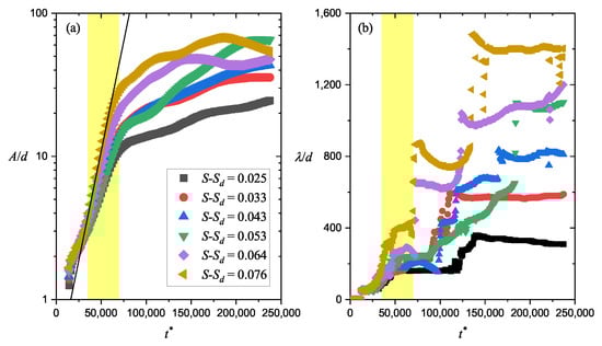 Sand ripple amplitude (a) and wavelength (b) increase with time. Different colors represent different wind strengths. The bright yellow shades highlight the initial stage of the ripple formation. In (a), for the amplitude result corresponds to , black line is the fit line within the initial stage representing an exponential growth.