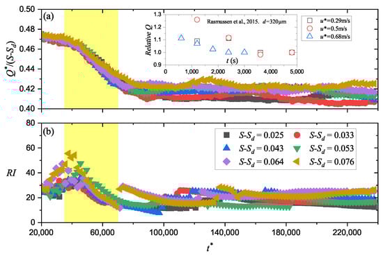 Next, we checked the sand flux variation during ripple formation. In this work, the horizontal sand flux Q was calculated as the average horizontal particle momentum per unit bed area, i.e., , where N is the particle number in the air; is the bottom area of the entire computation domain; and represents the time average. We nondimensionalized Q via . The temporal evolution of in different wind strengths is shown in Figure 4a. According to former experimental and numerical works [19,31,32,33], we have already known that there is a linear relationship between Q and the Shields number S. Thus, instead of , here we checked to reveal more information. It is worth mentioning that the threshold used here was evaluated at 20,000. As the result shows, holds a relatively stable value in the beginning of bed deformation. Then, an obvious decrease happens within the initial stage of the ripple formation. After the initial stage, a new stable value of was reached. Except the decrease in sand flux, we noticed derived from different wind strengths no longer coincided to each other after the initial stage. This can be caused by two possibilities: (a) varies during the initial stage or (b) the relationship between and is not linear on the ripple surface. The latter is less likely to be true, because as we know, the linear relationship has already been proved by many experiments, which are always performed on ripple surface.