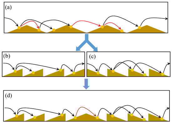 A sketch of our simplification procedure. Black lines represent monotone trajectories. Red lines represent non-monotone trajectories. (a) is the original system. (b,c) are systems that only contain the particles with monotone trajectories. (a) can be roughly approached by the combination of (b,c), which is shown in (d).