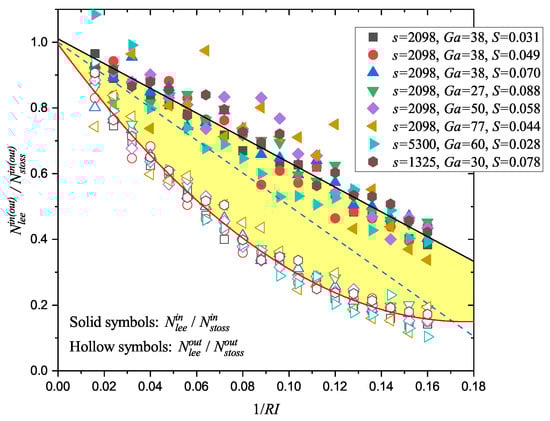 We first tried to simplify the problem. As Figure 5a shows, reptating particles and saltating particles bounced forward along the wavy bed surface. There are two typical movement modes for them. One is hopping from a stoss slope to another stoss slope or from a lee slope to another lee slope (black lines in Figure 5a demonstrate this kind of particle trajectories); the other one is hopping from a stoss slope to a lee slope or from a lee slope to a stoss slope (red lines in Figure 5a demonstrate this kind of particle trajectories). We defined the former trajectories as monotone trajectories and defined the latter as non-monotone trajectories. As Figure 5b,c shows, if all the particles have monotone trajectories and if we only study the ensemble average results, the whole system can be estimated by the combination of two simpler sub-systems, which only have a stoss slope or a lee slope. The particle with a non-monotone trajectory can be considered as a link, which transmits energy between the system shown in Figure 5b,c. We checked this energy-transmitting capability by counting the particle number that impacts the surface or take-off from the surface. represents the total number of impact particles that hit the stoss slope, and represents the total number of the particles take-off from the stoss slope. Similarly, we also had and for the lee slope. We checked for the impact and take-off particles, because this ratio was useful for the subsequent studies. In Figure 6, we found decreased linearly with 1/RI, meanwhile, decreased quadratically. These decreased relationships are all independent to the wind strength and the particle/fluid properties. Moreover, there was a difference between these two ratios, which is demonstrated by the bright yellow shade. This difference was due to the contribution of the non-monotone particle trajectories. Because if all particles have monotone trajectories, we can easily derive and . This yields an expression
