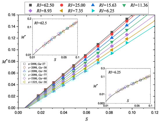 where is the dimensionless form of M; . It shows a linear relationship between and S. From the simulation results shown in Figure 7, we proved that always holds for different , different s, and different . Additionally, we found is obviously influenced by . The weak effect from s can be observed from the result, as well. To obtain the relationship between and , we used to roughly estimate the slope angle. Then, we have