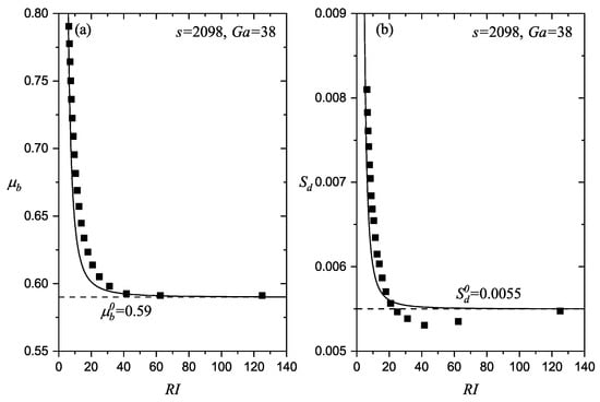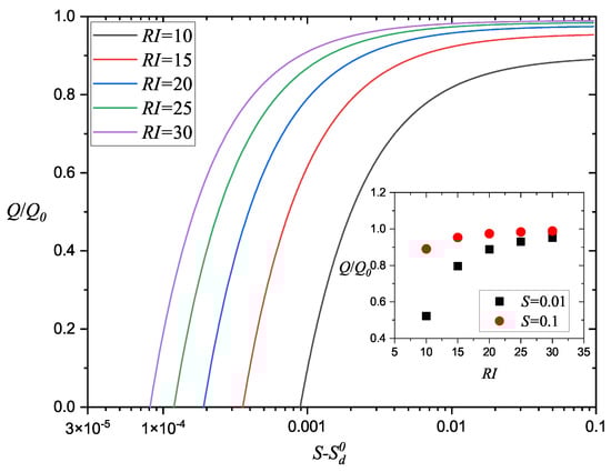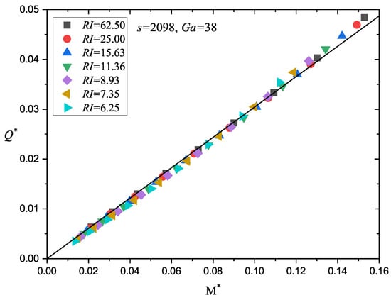 To perform further studies on the relationship between Q and , we ran several extra cases with pre-rippled sinusoidal wavy surfaces (triangular wavy surfaces and sinusoidal wavy surfaces showed no differences on the result). For all the cases, the amplitude A was set as , which is observed in Figure 3a as a typical amplitude within the initial stage. The wavelength varies from to , making the ripple index range from 6.25 to 125. The study on the situations with was necessary, because for some specific conditions, the sand bed will develop to mega ripples, which has a much smaller ripple index [34]. For every pre-rippled simulation case, the code module that contains Equation (15) is disabled, and we reserved enough time for all the cases to ensure them to reach the saturated state. This procedure helped us to strictly control the value of . To derive authentic results, for all the pre-rippled cases, the density ratio s was set between 1325 and 5300; ranged from 27 to 60; and S varied from to . The other settings were the same as the settings of the ripple formation cases mentioned before.