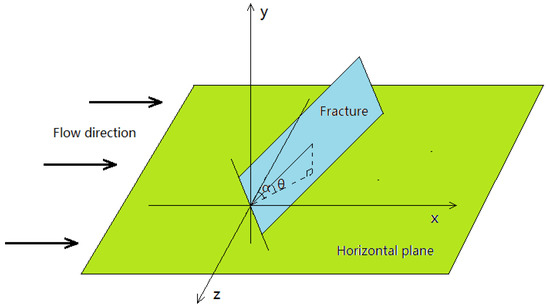 where is gas hydrodynamic viscosity, is difference of pressure for a fracture, is length for a characterization unit. When considering the spatial orientation of fractures (as illustrated in Figure 1), the flow rate for single crack yields [32,33,34]: