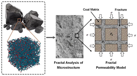 As the main channel for gas migration in a reservoir, fracture length is unevenly distributed, with varying degrees of tortuosity and a complex structural distribution. The connection state of the coal pore-throat network will directly affect oil and gas recovery [1,2,3]. Moreover, the coal fracture network is also complex [4,5,6]; therefore, accurately exposing the connectivity of the reservoir structure and quantitatively investigating the interaction between the reservoir microstructure and the macroscopic behavior at the micro scale is the key to improving gas recovery [7,8,9,10]. In recent years, an increasing number of studies have demonstrated that fractures in unconventional reservoirs have distinct fractal characteristics and that fractal theory is better able to quantitatively characterize the distribution of fracture structure networks.