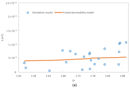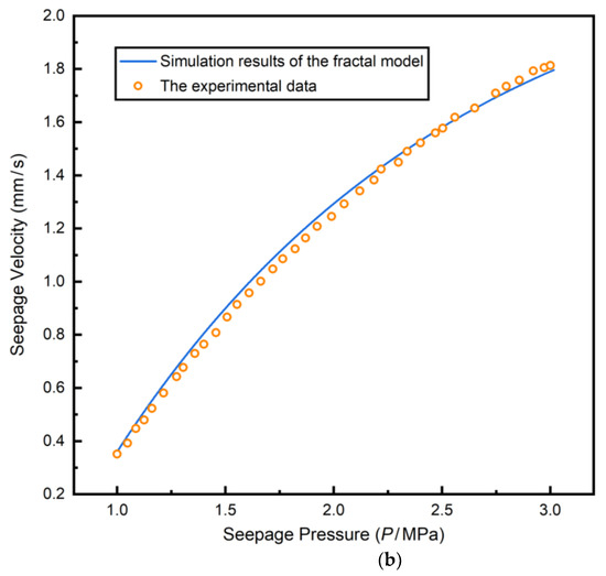 The fractal dimension of the fracture length for 22 different natural fracture networks was calculated by Jafari and Babadagli [35] on the basis of the box-counting method, and then a fracture network of was constructed. The maximum length of the fracture was 2 m, and the fracture dip angle was 0. To verify the fractal fracture network model, the fractal model was compared with the above simulation results, as shown in Figure 4a. In addition, the simulation results of the fractal model in this paper were also compared with the seepage experimental results of rocks with different porosities [36] in order to further verify the rationality of the model, as shown in Figure 4b.