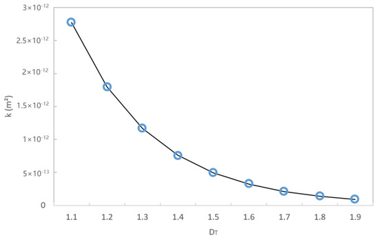 Figure 5 shows the curve of the permeability verified with DT. According to Figure 5, the permeability gradually decreases with increasing DT. This corresponds to the physical truth. Under the same inlet and outlet pressure difference, with increasing DT, the bending degree of the crack increases, so the fluid resistance through the fracture increases and the permeability decreases.