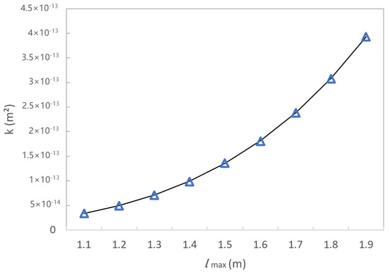 The interaction between permeability and maximum fracture length is illustrated in Figure 6, i.e., k increases rapidly with increasing lmax. The main reason for this is that the total number of fractures decreases with the increasing length of a single fracture, and the small fractures tend to converge on several fractures, which reduces the flow resistance of the fluid.