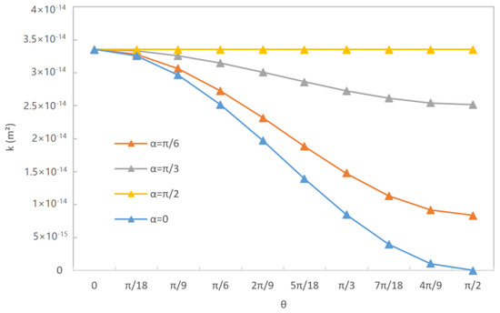 As illustrated in Figure 7, when the azimuth angle of fractures is constant, the permeability decreases with the increase in dip angle . When the dip angle is 0, the direction of the fluid flow is located on the fracture surface, and the resistance of the fluid flow is smallest, which is consistent with the physical truth. Furthermore, if the dip angle is constant, the permeability increases with the azimuth angle of fractures. When the fracture azimuth is , the direction of fracture coincides with the direction of the fluid flow, and the fluid resistance is smallest.
