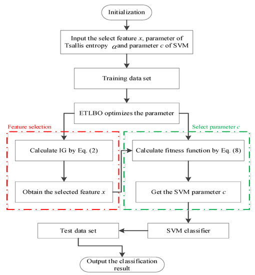 The proposed classification method can be divided into two parts: feature selection and the parameter selection of the SVM. At first, the Tsallis entropy of the target is calculated using Equation (1). Then the entropy of each feature concerning the target is calculated and subtracted from the target’s entropy using Equation (2). In this process, the selected feature x and the parameter of Tsallis entropy are optimized by the ETLBO. The parameter can decide the ability of the Tsallis entropy.