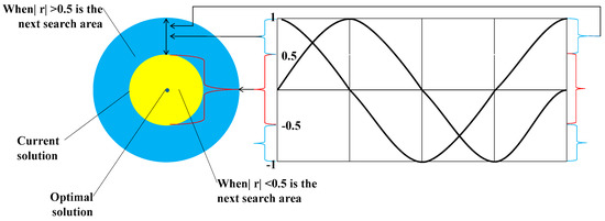 In the above formula, according to parameter , the algorithm can determine the direction of the next iteration. The operation occurs when the distance from the parameter value to the abscissa exceeds 0.5, that is, the value is distributed between 0.5 and 1 or between −0.5 and −1, in the outer ring area shown in Figure 1. When the distance between the parameter value and the abscissa is less than 0.5, that is, the function value is distributed between −0.5 and 0.5, the search is performed in the circle area shown in Figure 1. The parameter is a number randomly selected between 0 and each time. Parameter is used to determine the random allocation of the enhanced or weakened relationship, and a size comparison with 1 has been used to determine whether the relationship is enhanced or weakened. As can be seen from the Formula (3), the parameter value of can select the type of the sine and cosine function, when , the equation containing only the sine function is selected for the next iteration. When , the equation containing only the cosine function is selected for the next iteration. Through the above iteration, it can be guaranteed that the algorithm has the same probability in global search and local search, so that the algorithm itself can combine the benefits of both search modes itself to achieve better results.