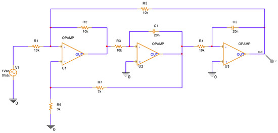 In this essay, the data were studied by extracting the data in different modes of the Sallen–Key circuit. Circuit structure, individual component types and values are shown in Figure 3. Here, the parameter value is set to deviate from the original value by 50%, the capacity is set to deviate from the original value by 10%, and the resistance is set to deviate from the original value by 5%.
