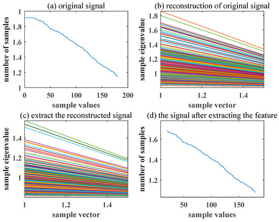 In this paper, the wavelet packet was used for feature extraction. The feature extraction is representative data extracted from a large amount of data, so the original signal is similar but not identical to the signal after feature extraction. In Figure 7, it can be seen that Figure 7a is similar but not the same as Figure 7d. The main function in the step of extracting features is to obtain highly representative data in the overall data, that is to remove redundant data. In Figure 7, it can be seen that Figure 7c contrasts Figure 7b with the redundant signal data removed.