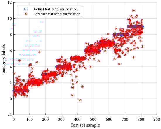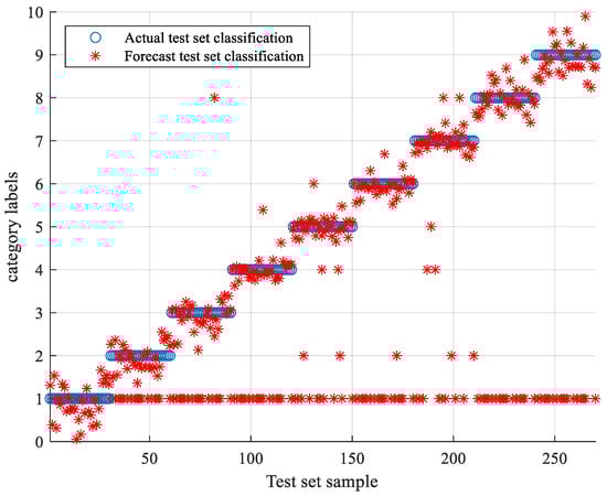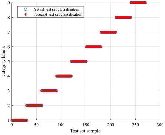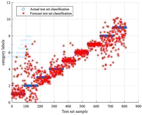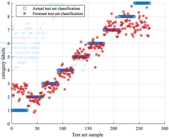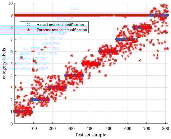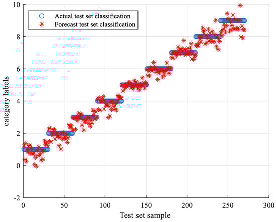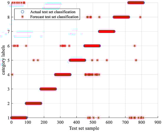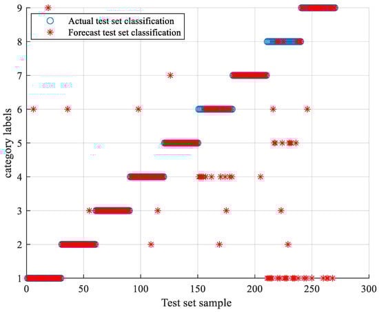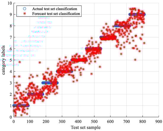 In the comparison classification algorithm, the common second-order filter, which is the Sallen–Key circuit, is used for comparison experiments. To verify the versatility of the conclusions of the comparison method, a multi-stage filter, which is a CSTV filter circuit, is used for verification. Since the CSTV filter circuit is more complex and there are more aspects to consider in the fault diagnosis, the data of the CSTV filter circuit is added for a better analysis. So, for the CSTV filter circuit, a total of 1800 samples were collected, of which 900 samples constitute the training data set, and the remaining 900 samples constitute the test data set. In Figure 27, Figure 28, Figure 29, Figure 30, Figure 31 and Figure 32, the classification effect of CSTV filter circuit fault data with different classification algorithms is shown in detail.