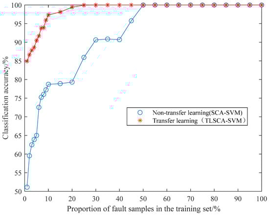 The conclusion can be drawn from Figure 33 that when the training sample is relatively small, the traditional SCA-SVM classification algorithm cannot effectively perform fault diagnosis. The classifier trained by the non-transfer learning model is not effective in the fault diagnosis of few-shot learning. Classifiers with transfer ability have certain advantages in few-shot learning. As the proportion of fault samples increases, the effect of transfer learning becomes weaker. When the proportion of fault samples reaches 50%, the effect of transfer learning and non-transfer-learning fault diagnosis is the same. When the proportion of faulty samples does not reach 50%, the classifier with transfer learning ability shows better classification performance in fault diagnosis. This article classifies the performance of the TLSCA-SVM classification algorithm in fault diagnosis as better than SCA-SVM fault samples when the proportion of faults does not reach 50%.