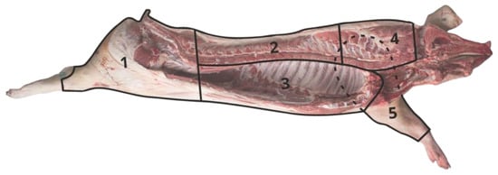 At the slaughterhouse after 24 h of cooling, the left sides of the pig carcasses were dissected according to the modified “Kulmbach” method [20], as schematically presented in Figure 1. The main parts were then further dissected into muscle tissue, fatty tissue (intermuscular and subcutaneous with skin) and bone, and then they were weighed. The weights of the parts (dissected and non-dissected) were measured using a Mettler-Toledo Viper SW 15 scale (Mettler-Toledo, Greifensee, Switzerland).
