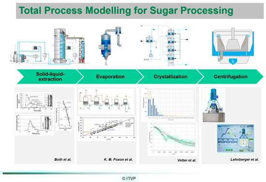 To answer the increased demand for high-purity natural products, resulting from changing patterns of consumption in developing countries, as well as the demand for medicines of natural origin, it is called for an efficient total process design based on a quality-by-design approach [7,8]. For the production of sugar, the potential for optimization of extraction processes via a digital twin and the resulting increased process understanding has already been shown [9]. Furthermore, other process steps in the production of sugar have sophisticated process models [3,4,5,10]. An overview of the potential total process modeling is given in Figure 1. Process models for the extraction of sugar from beets have been shown to accurately model the hydrodynamic and substance transfer in the extraction process, as shown by Both et al. [9]. Furthermore, evaporation and centrifugal modeling were recently discussed in the ISJ World Sugar Yearbook by Foxon and Lehnberger, respectively [11,12]. This work shows a model-based approach to link the evaporation and centrifugal models with a sophisticated crystallization model.