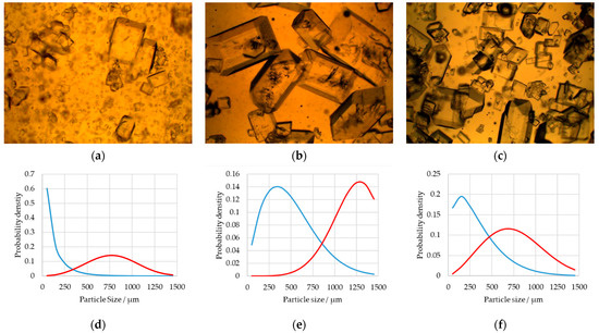 Crystallization results of three experiments in the DoE (a–c). In (d–f), the corresponding particle size densities are given. Here, the blue line is the q0 distribution, and the red is the q3 distribution.
