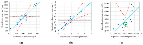 Results of the linear DoE scheme for (a) particle size ( (b) skewness of the particle size distribution (k), and (c) crystallization endtime. The blue line shows ideal fit, the red dashed lines 95% confidence intervals, and the black dashed line the average.