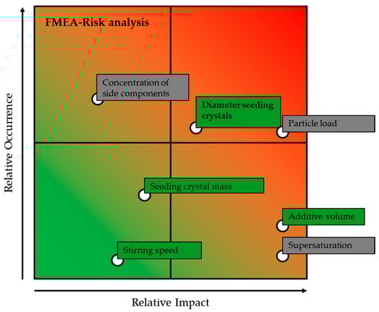 On the evaluation of the DoE, a failure mode and effect analysis (FMEA) can be based, as the impact of failures in the secondary process parameters can be assessed. The resulting FMEA is given in Figure 5. Green influences are the process parameter influences based on the DoE. Occurrence is based on prior knowledge. For example, the additive volume has shown a high impact on the crystallization process, however, in the scale of 1 mL additive per 1 L crystallization volume, it is easily dosed in industrial scales. The grey failures are other possible influences not evaluated in this study which can be expected to have a significant influence, however, solutions to these are already employed in the industrial processes or their occurrence and influence are low. For example, the particle load would have a high relative impact, as it could start the crystallization uncontrollably, this, however, is mitigated by a prior filtration. Supersaturation would have a high impact, however, the occurrence is relatively low, as evaporation is a well-controlled process.