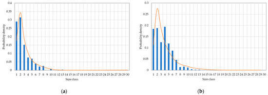 To visualize these in Figure 6, examples of the parameter estimation are given. The model is able to depict the distribution broadening resulting from changing seed crystals and stirrer speeds. A large extent of the observed errors results from the measurement deviations as can be observed in (b). Here the model would expect a large concentration of crystals in class 3, however, much of the counted crystals are of class 4. In other experiments, as shown in (a), the smaller crystals are overrepresented in the data compared to the model. This is probably due to the smaller crystals are easier to count. Methods to rectify this effect are further discussed in Part 4.