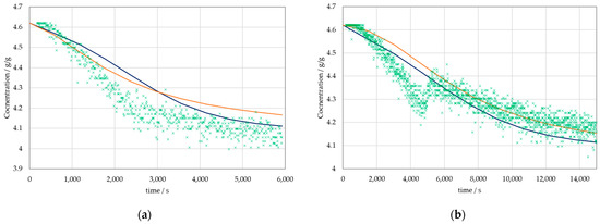 The fit of the concentration courses was also satisfying. In Figure 7, the concentration courses of two different experiments are given. Comparing (a) and (b) the range of crystallization times in the DoE, resulting from the secondary effects becomes obvious. The model allows for a good representation of the concentration course, even as the crystallization times change from 5000 to 15,000 s. Experiments shown here are from the 0 mL additive determination scheme, as such, the effects in particle size distribution and crystallization times that can be observed, solely result from the changed initial variables, which are seed crystal mass, size, and stirrer speed.