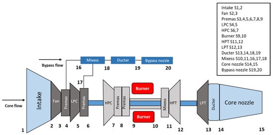 Figure 1. Research engine Turbomatch thermodynamic model showing numbered stations and component modules.