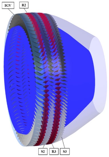 As previously mentioned, the case study selected for this research is based on the first two stages of the LPC based on NASA’s E3 engine [27,28,29]. The LPC comprises inlet guide vanes (IGV), second rotor (R2), second stator (S2), third rotor (R3) and third stator (S3), comprising a total of 458 blades. Comprehensive technical details of the research engine can be found in [5]. For the geometric details of the research engine showing the locations of the IGV and first two stages of the LPC, see Figure 2.