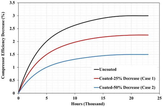 Three scenarios regarding LPC degradation over the operational life of the research engine are investigated: uncoated LPC blades with the efficiency decrease of the compressor reaching 3% in the latter life of the engine; coated compressor blades presenting a reduction in the degradation of 25 and 50% by reference to the uncoated variant. These two scenarios are known as Case 1 and Case 2, respectively. The LPC performance deterioration with service hours is applied as an efficiency decrease whose asymptotic evolution follows the degradation observed in industrial GTEs [39], Figure 3. For the majority of civilian aircraft, compressor erosion does not represent a significant issue over extended periods of operation. However, where it does, service lives will be severely reduced, such as in the case of extensive exposure to airborne sand particles. The scenario we investigate is intermediate between these two situations in that the erosive degradation takes place over an extended period.