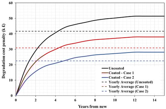 The analysis of Figure 6 shows that the provision of EPCs is associated with an extension of the useful life from 11 years for the uncoated scenario to 12 or 13 years according to the particular level of erosion protection. For the purposes of this study, the yearly depreciation is represented by a single value, which, for the uncoated and coated Case 1 and Case 2, is GBP 391,281, 367,711 and 347,504, respectively. Therefore, the average saving by deploying EPCs is, over the life time of the HPT, GBP 23,570 and 43,776 for Case 1 and Case 2, respectively.