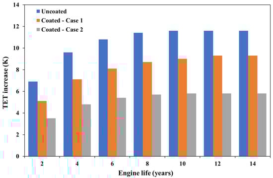 The increase in TET with the degradation of the compressor was computed in Turbomatch for the uncoated scenario together with the two EPC cases that are being investigated. The results of the calculations portray an asymptotic increase, year on year, of TET by reference to the design value, for each of the three cases examined as is shown in Figure 5. As can be observed, the fitting of EPCs promotes the reduction in the yearly TET increases, thereby contributing directly to an extension of the useful life of the turbine, with direct implications on the economics of the GTE operation, as will be seen next.