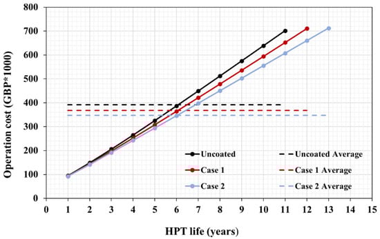 Although the increases in TET are modest in absolute terms, they nevertheless have a major impact on the working life of a high-pressure turbine (HPT). For the purposes of this study, we adopt a simple turbine life model according to [47] whereby, for every 20 K rise in the operational TET, by reference to the design point (DP) value, the creep life of the HPT reduces by half. The economic implications of the cumulative impact of the reduction in the useful life of the HPT associated with the TET variation described in Figure 5 is examined next. The solid lines plotted in Figure 6 correspond to the operational cost of the HPT based on the predicted turbine life as a function of the running temperatures and initial acquisition cost (GBP 672,750) [42].
