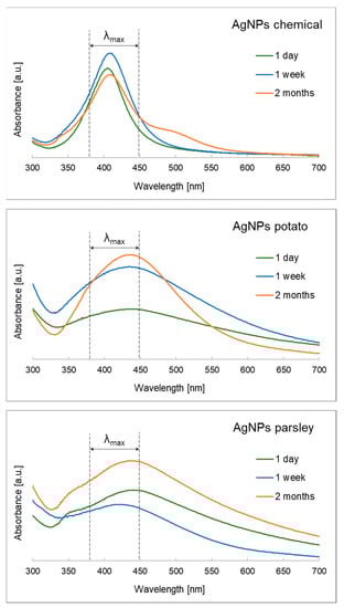 The presence of silver nanoparticles is confirmed by the occurrence of an absorption maximum in the range of about 380–450 nm [,]. The analysis of the UV-Vis spectra of the nanosuspensions obtained directly after the synthesis, and then after 1 week and 2 months, confirmed the above theoretical assumptions, as shown in Figure 1. A clear difference was observed in the appearance of the spectra—shape, symmetry, peak width, as well as their location depending on the colloid tested. It has been demonstrated that the classical method, in which the reduction in silver occurs rapidly in time—at the point of mixing the metal ions with molecules of a strong reducing agent—leads to sharp, symmetric peaks with the absorption maximum shifted toward shorter wavelengths (λmax~400 nm), which indicates monodispersity and the achievement of nanometric sizes not exceeding several tens of nanometers. This tendency is maintained throughout the research—a characteristic, narrow peak is also present two months after the synthesis. The spectra are different in the case of biogenic synthesis, which uses raw plant materials without the use of additional reducing and stabilizing components. When plant infusions were used, silver nanoparticle colloids were successfully obtained, with asymmetric flattened and broadened peaks with absorption maxima shifted toward longer wavelengths, proving that larger and polydisperse nanoparticles were obtained in comparison to those acquired by the method of using a strong reducing and stabilizing component. According to the literature data and previous studies of the authors, it has been proven that with the increase of nanoparticles in suspension, more electrons can scatter the incident electromagnetic wave, which leads to disturbances in the absorption process. As a result of the so-called retardation of the electromagnetic wave, the spectral spectra obtained are slightly broadened compared to the spectra obtained after the irradiation of small particles and a redshift of λmax is observed, as is the case with the spectra of AgNPs potato and AgNPs parsley colloids [,]. Moreover, it should be emphasized that numerous chemical compounds are present in the infusions, which comprehensively reduce and stabilize the particles, causing the particle coated with anti-aggregation substances to have a larger diameter. The 2-month-old colloids show the expected stability over time. In the case of samples with infusions from plant waste, the older suspension gives the clearer spectrum, which means that in samples obtained with the biogenic method, the time of reducing ions to free atoms is extended and the reducing-stabilizing agents act less rapidly in comparison with a strong reducer (sodium borohydride) in the chemical method.