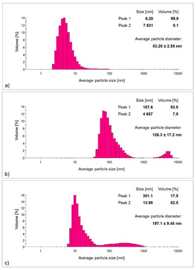 The particle sizes and the size distribution of the nanoparticles were analyzed by DLS using a Zetasizer Nano ZS apparatus manufactured by Malvern Instruments Ltd. (Malvern, UK) and equipped with a 4 mW helium–neon laser that produces photons with a wavelength of 633 nm. Each of the samples was measured three times, each measurement consisting of six 10 s runs, which precisely determines the main values. The measurements were carried out at a temperature of 25 °C.