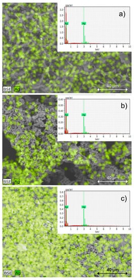 The EDS-SEM images of freeze-dried 1-week-old silver nanoparticle colloids with silver distribution and confirmation of its presence obtained by: (a) classical method (AgNPs chemical); (b) biogenic method using potato waste (AgNPs potato); (c) biogenic method using parsley waste (AgNPs parsley), magnification ×1000.