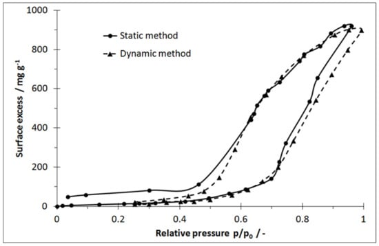 For the investigations discussed here, water adsorption is of central importance. Figure 2 illustrates the water adsorption isotherm of BAX 1100 at 24 °C. It was determined by using two different methods, thus demonstrating the reproducibility of the results. The course of the adsorption isotherm—type V according to International Union of Pure and Applied Chemistry (IUPAC)—is typical for the sorption of water vapor on activated carbons. Due to the strong hydrophobicity of BAX 1100, it hardly adsorbs any water up to relative humidities of 50–60%. Adsorption by capillary condensation only increases sharply above approx. 70% RH. During desorption, a strongly pronounced hysteresis is observed with a remaining residual load.